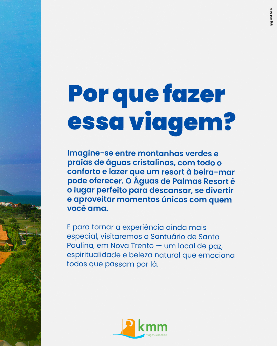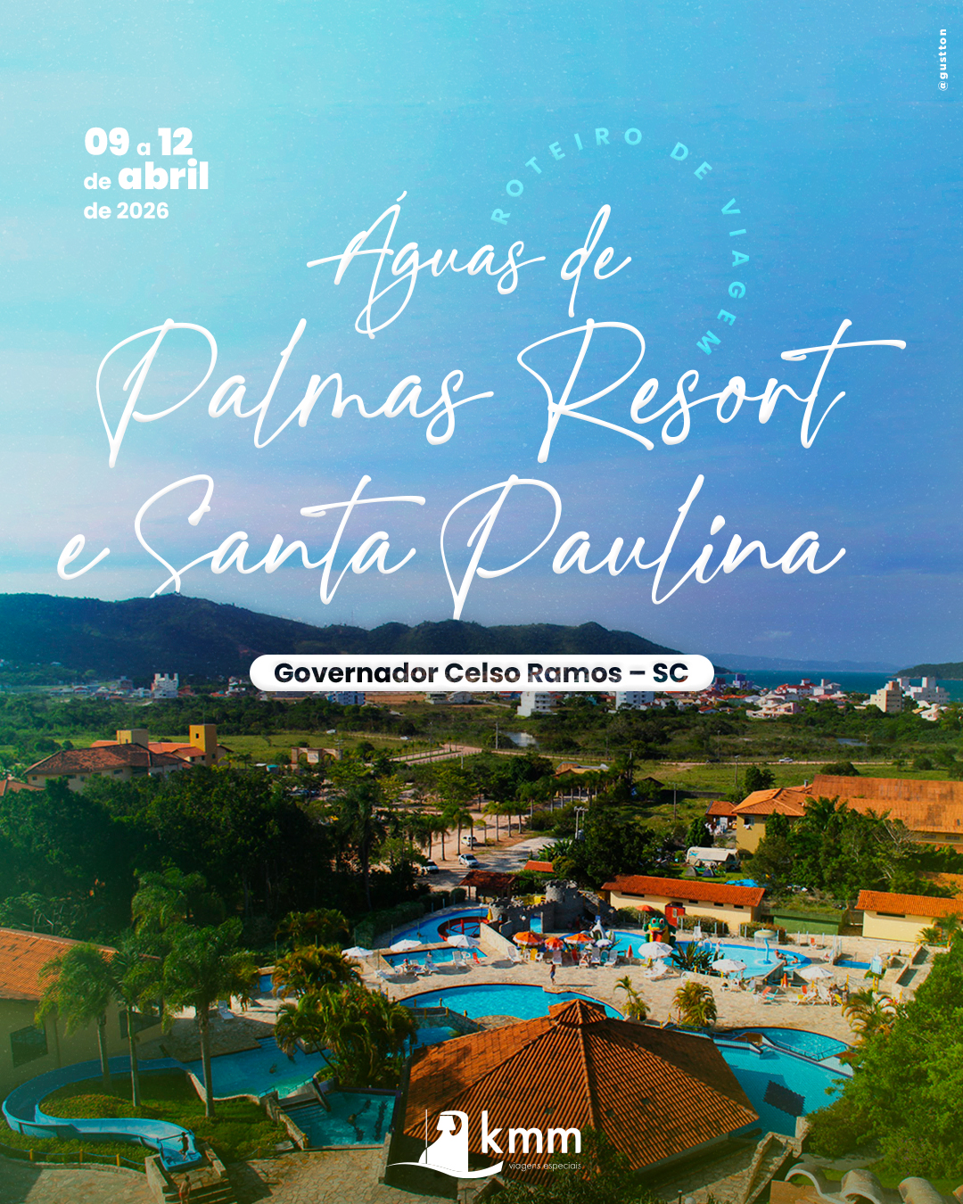 Localizado em meio a paisagens deslumbrantes, Governador Celso Ramos é um verdadeiro refúgio para quem busca tranquilidade e contato com a natureza. São mais de 40 praias de águas cristalinas, cercadas por serras e uma vegetação exuberante. É nesse cenário privilegiado que está o Águas de Palmas Resort, com estrutura completa à beira-mar e rodeado pelo verde das montanhas. O resort oferece diversas opções de lazer, como parque aquático, trilhas ecológicas, quadras esportivas, sala de jogos e um espaço kids. Um lugar perfeito para viver momentos inesquecíveis. E para completar a experiência, visitaremos também o Santuário de Santa Paulina, um espaço de fé, paz e devoção que encanta todos que passam por lá.