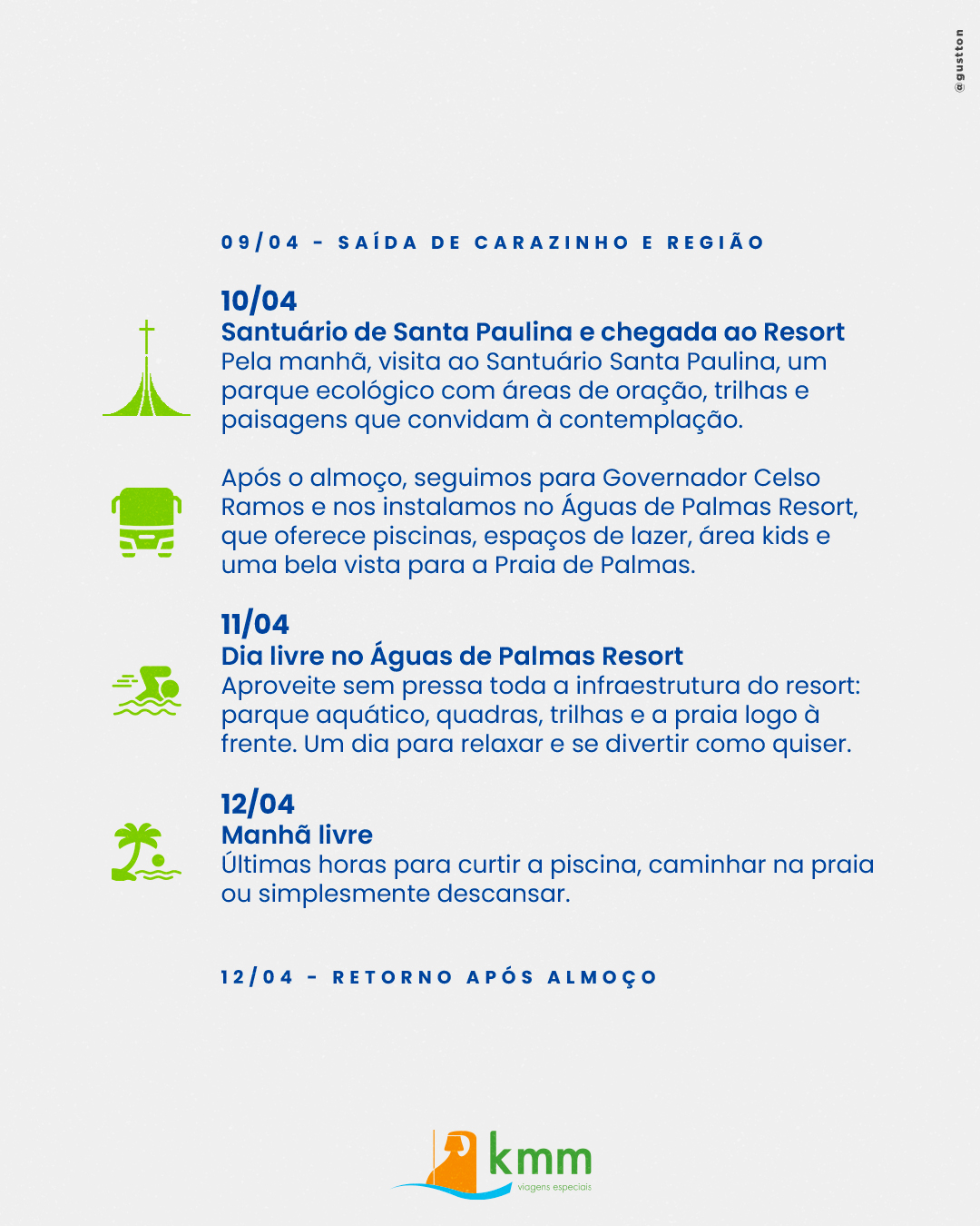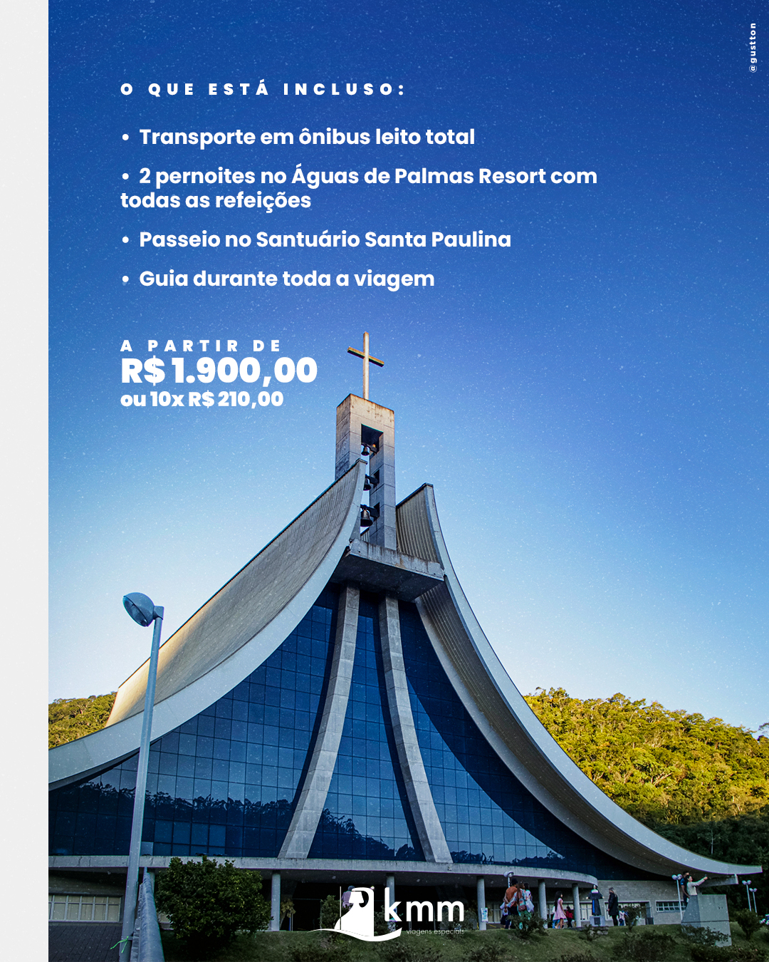 - 10/04: Pela manhã visitaremos o Santuário Santa Paulina, em Nova Trento. O Santuário é um parque ecológico, onde é possível passear, orar, contemplar a natureza através do verde da paisagem. Um momento de fé e espiritualidade. Após o meio dia iremos até Governador Celso Ramos, onde está localizado o Águas de Palma Resort. Em frente à praia e rodeado do verde das montanhas, o resort possui uma infraestrutura completa, com piscinas, espaços de lazer e esportes, área kids e recreação, além de refeições completas.