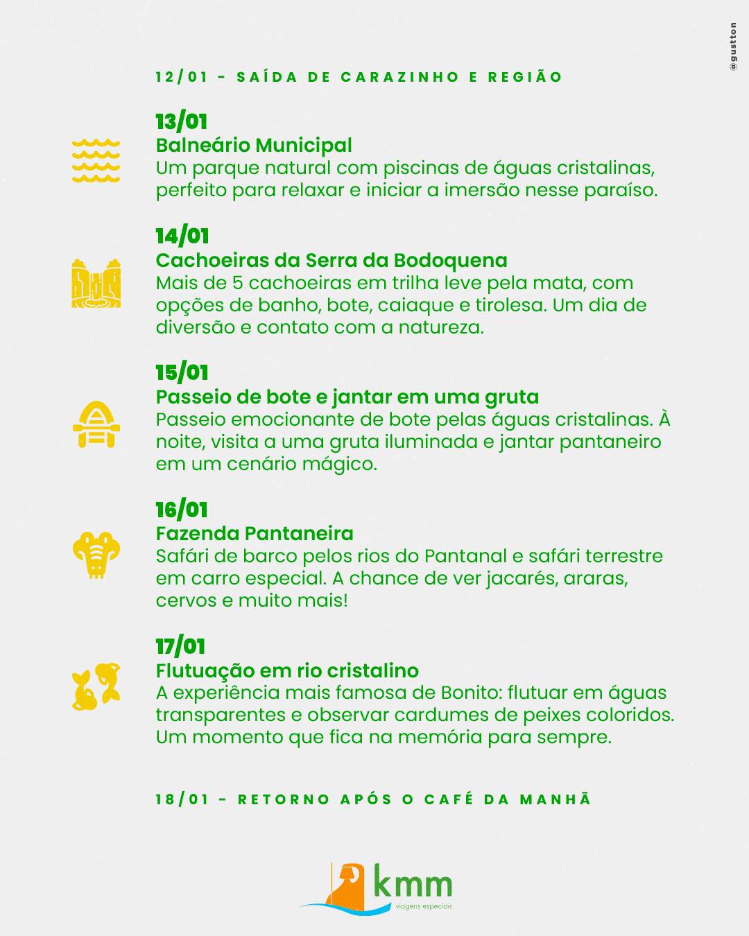 Dia de conhecer as famosas cachoeiras da Serra da Bodoquena, com sua água transparente, temperatura amena e ótimas para banho. Faremos uma leve caminhada em meio a mata visitando mais de 5 cachoeiras, balneário com passeio de bote, caiaque e tirolesa. Após tanta diversão teremos tempo livre para banho em um lindo parque.