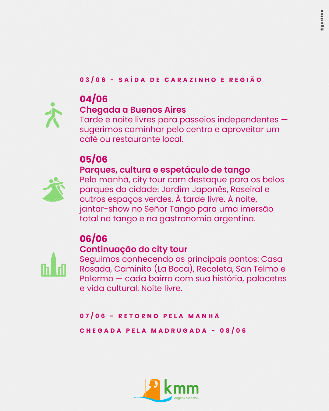 06/06 – Continuação do City Tour completo em Buenos Aires, passando pelos principias pontos da cidade como a Casa Rosada, a impressionante casa do governo argentino; Caminito, vila de casas coloridas em que moravam os imigrantes que chegavam a Argentina e local do Estádio do Boca Juniors; Recoleta e San Telmo, bairro onde moravam as pessoas mais ricas do país e cheio de palacetes; Palermo com seus belos jardins, parques e museus. Garanto que é um passeio mais lindo do que o outro!