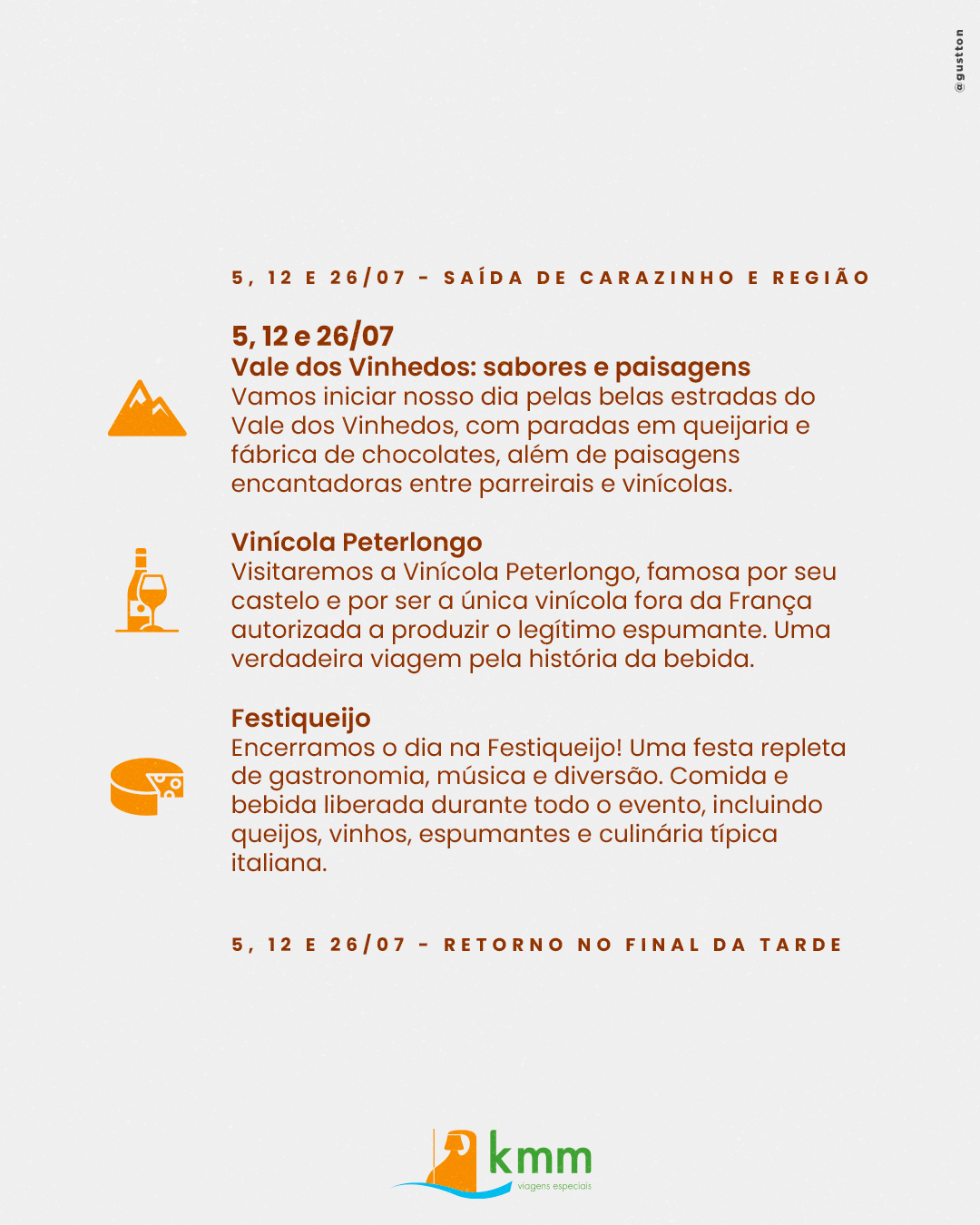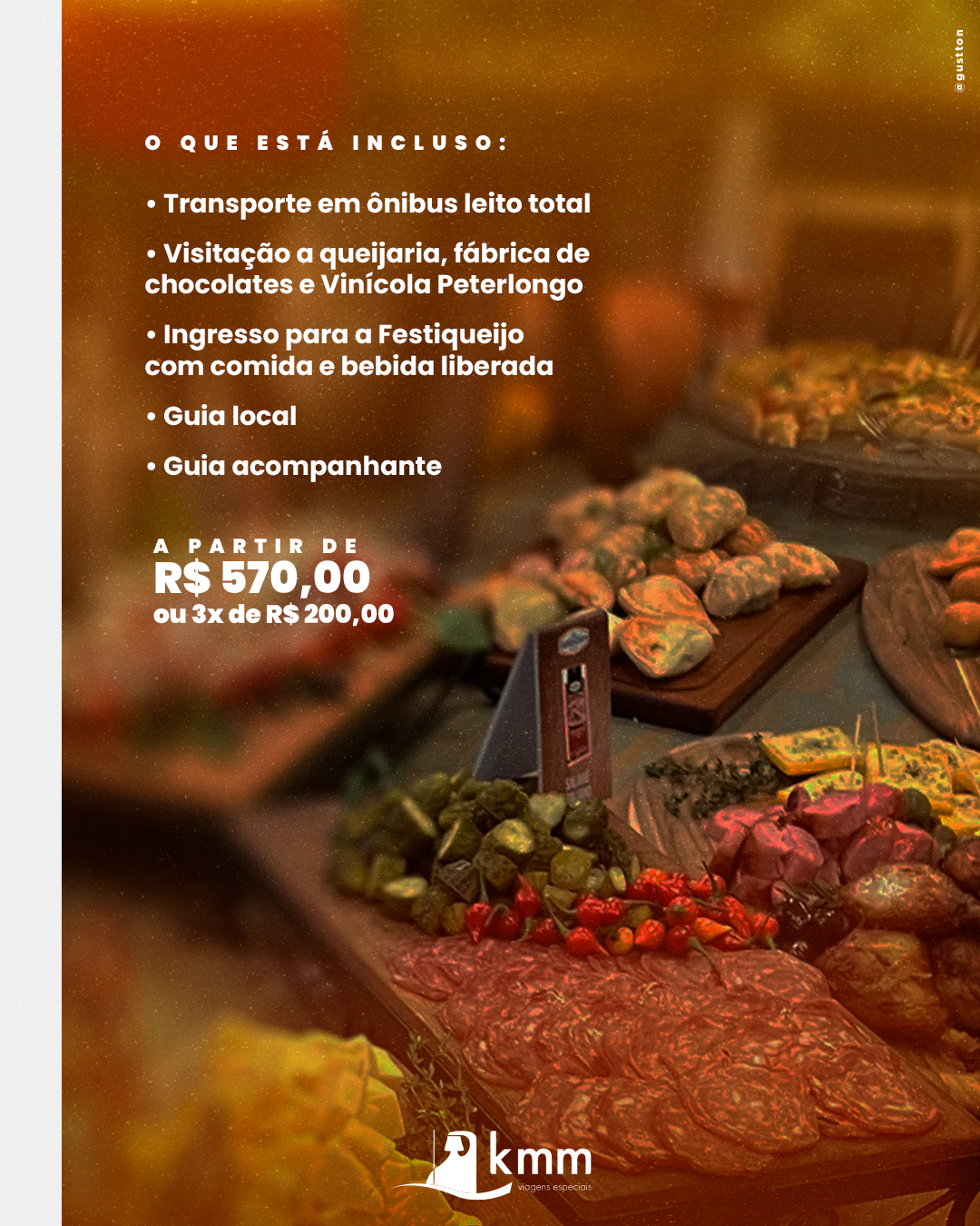 - E por fim, a parte mais esperada do roteiro: a Festiqueijo! Uma festa repleta de gastronomia, música e muita diversão, onde você poderá desfrutar de uma grande variedade de queijos, vinhos e espumantes, além da saborosa gastronomia italiana, ao som dos principais artistas locais. Comida e bebida liberada da chegada ao fim de tarde