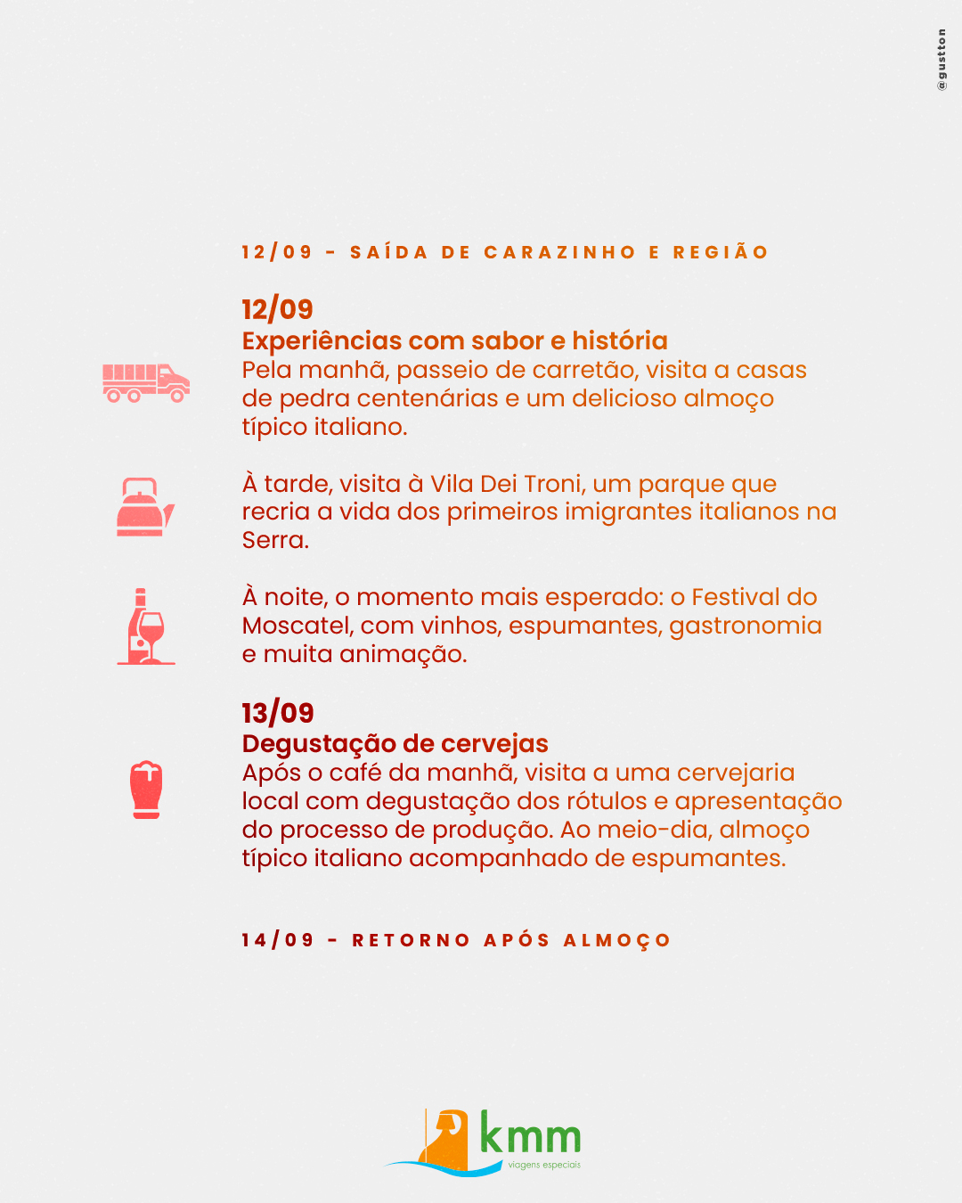 Durante a manhã faremos passeio de carretão, um delicioso almoço italiano e casa de pedras centenárias.