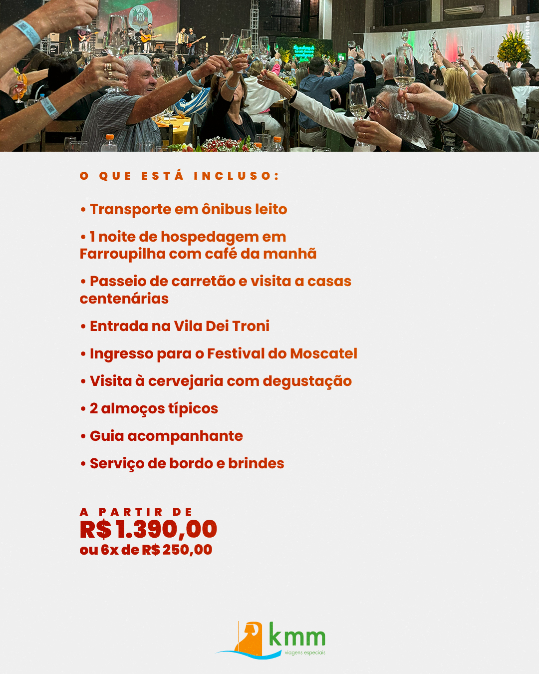 À noite, a parte mais esperada do roteiro: o Festival do Moscatel! Essa é uma oportunidade imperdível para degustar os melhores vinhos e espumantes, apreciar uma grande variedade de comidas e se divertir muito.
