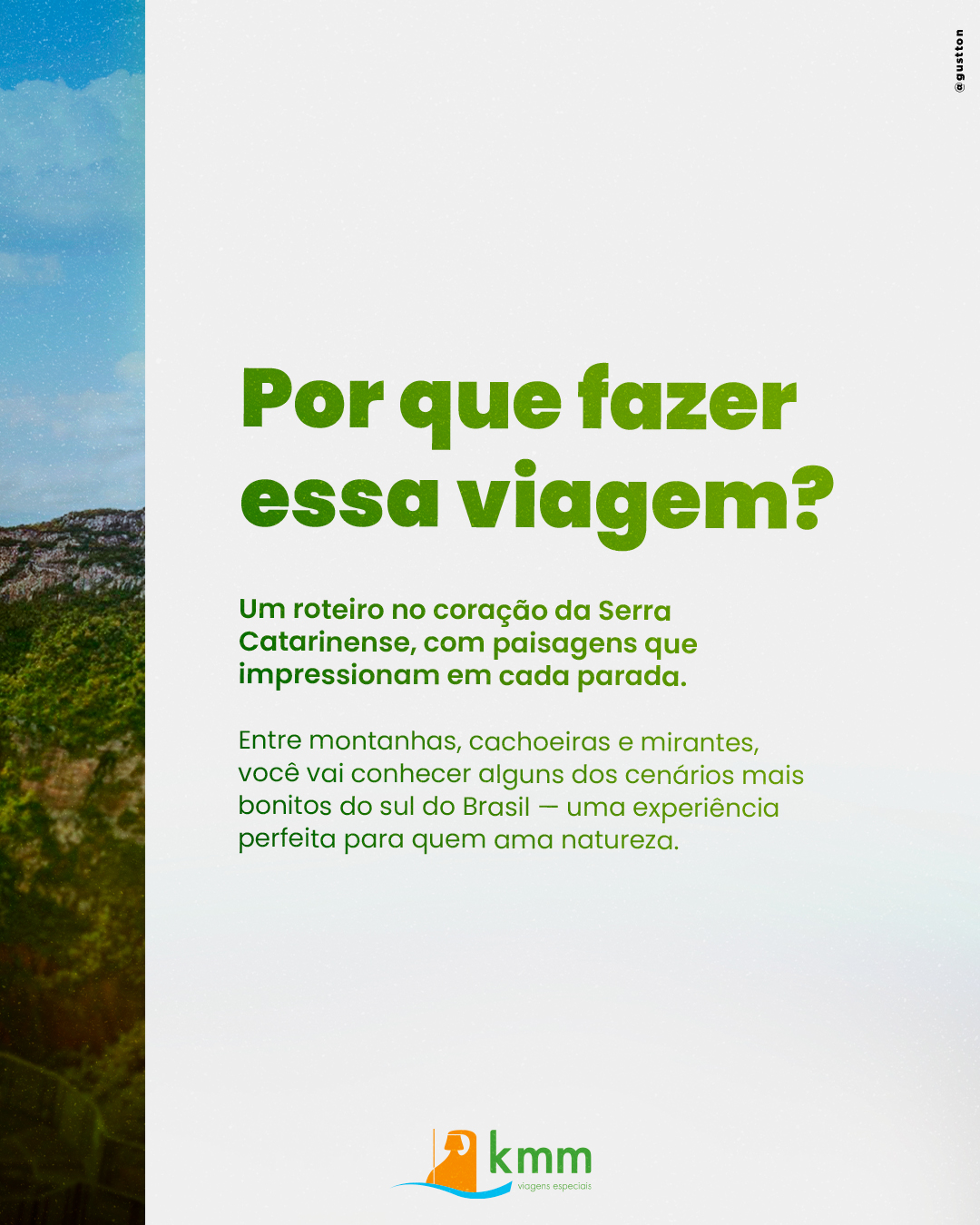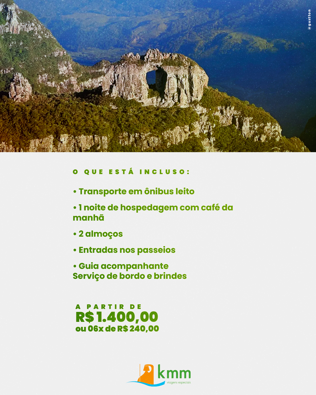 Um roteiro no coração da Serra Catarinense, repleto de paisagens deslumbrantes! Iremos conhecer a Serra do Corvo Branco, onde está o maior corte em rocha do Brasil. Visitaremos o Eco Parque Papuã, com sua passarela de vidro e duas cachoeiras, o Morro do Campestre e a Cascata do Avencal, uma das mais conhecidas da região.