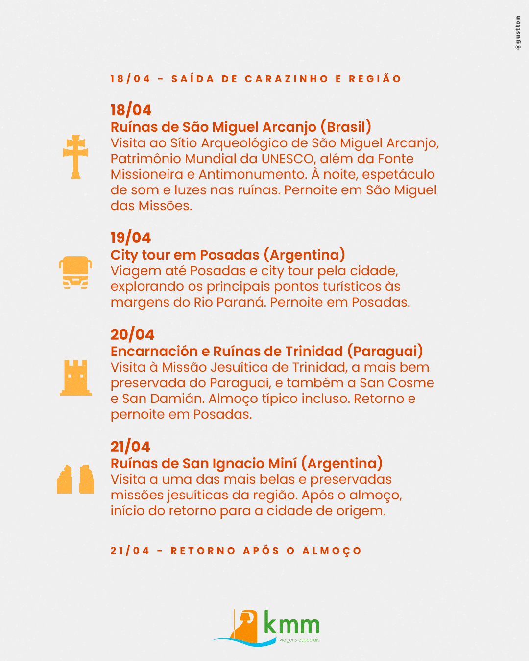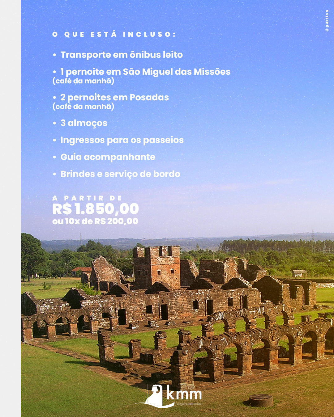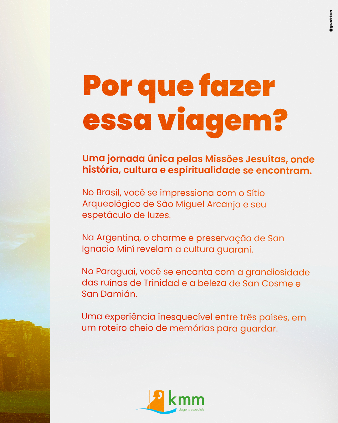 Embarque numa jornada histórica e inesquecível pelas Ruínas Jesuíticasdo Brasil, Argentina e Paraguai. NoBrasil, o Sítio Arqueológico de São Miguel Arcanjo impressiona com sua imponente igreja em pedra e o espetáculo de som e luzes. Na Argentina, os complexos bem preservados de San Ignácio Miní revelam a cultura guarani e a arquitetura missioneira. No Paraguai, maravilhe-se com as ruínas de Trinidad e com a Missão de San Cosme e San Damián. Uma viagem rica em cultura, espiritualidade e paisagens únicas!