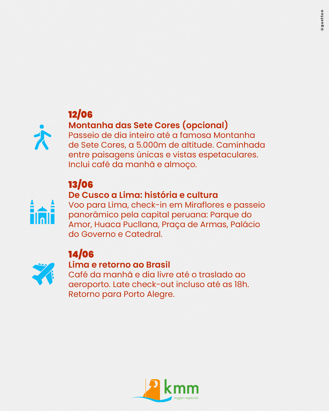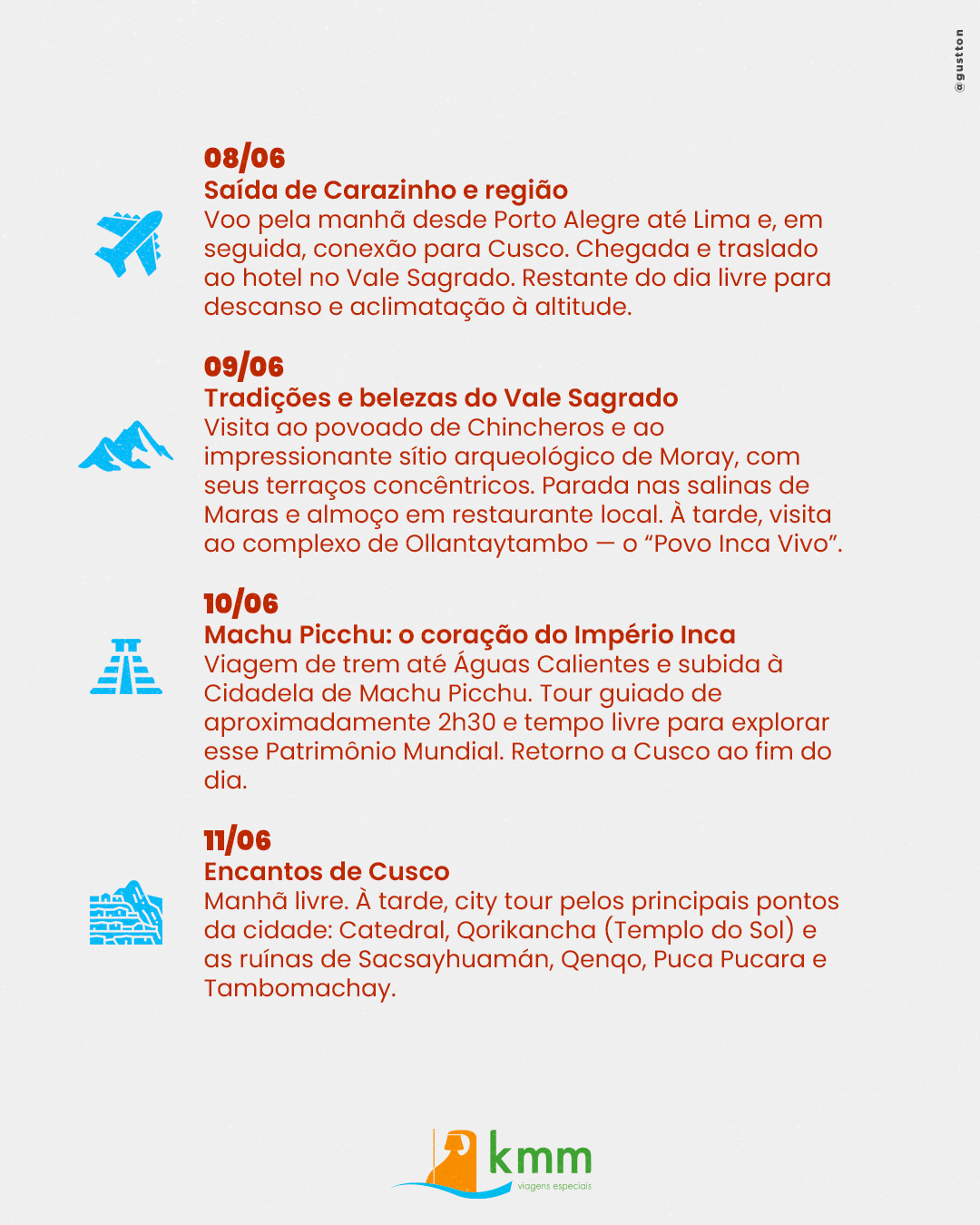 08/06 – Saída de Porto Alegre. Em voo pela manhã direto de Porto Alegre para Lima no Peru, em seguida voo para Cusco. Consultar sobre transporte saindo de Carazinho.