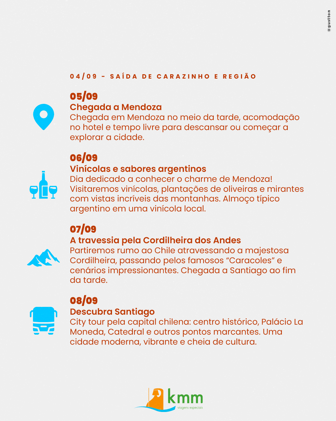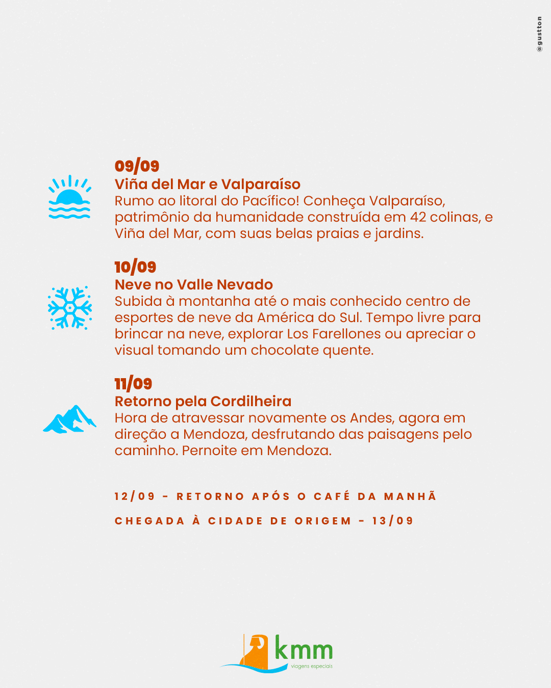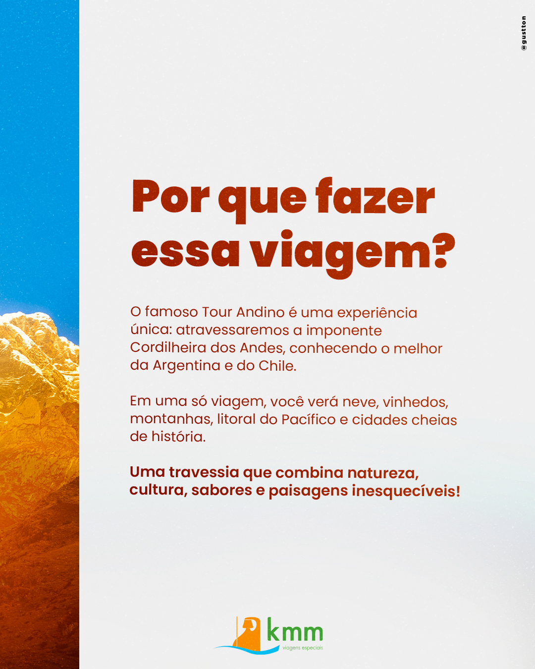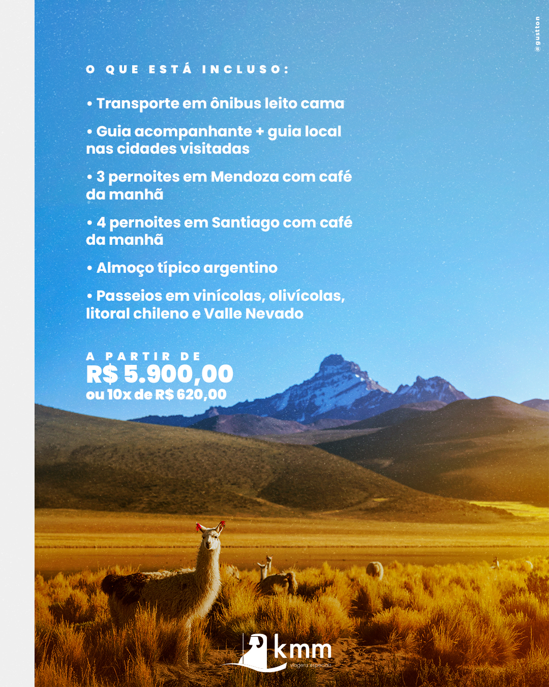 Um roteiro mágico e icônico! O famoso tour andino, atravessando a Cordilheira dos andes. Em uma única viagem vamos conhecer Mendoza, a cidade aos pés da montanha e que produz os melhores vinhos do mundo. Atravessar os andes passando pelos famosos Los Caracoles. Conhecer a bela capital chilena. Visitar as mágicas e pitorescas Vina del Mar e Valparaiso, na beira do Oceano Pacifico. Ver a neve no alto da montanha no Valle Nevado.