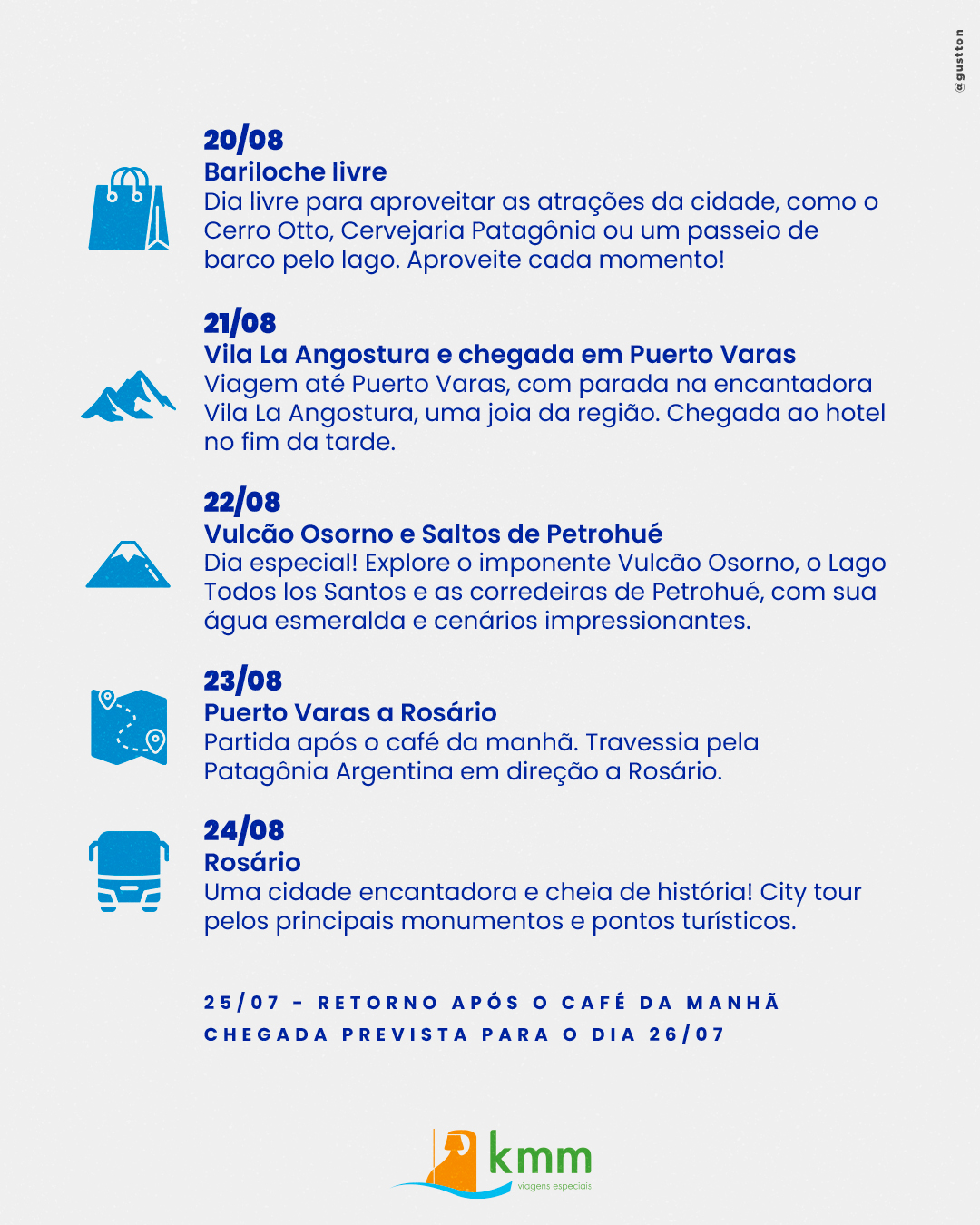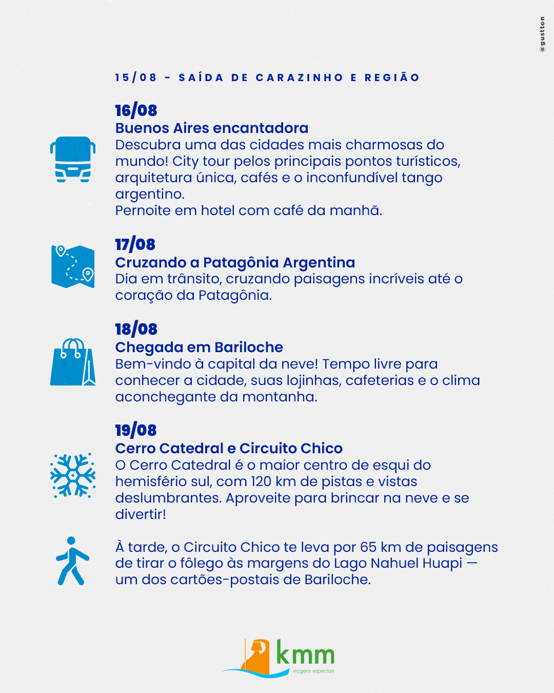 19/08 - Cerro Catedral - O maior centro de esqui do hemisfério sul, tem nada menos que 120 km de pistas. Possui cerca de 30 meios de subida, como bondinhos, teleféricos e cabos de ascensão, que levam os praticantes a até 2 mil metros de altitude. Aqui você vai poder brincar na neve, fazer bonecos e se divertir muito! Circuito Chico – um dos passeios mais tradicionais e obrigatórios em Bariloche! Este passeio percorre em torno de 65km, em sua maior parte às margens do emblemático lago Nahuel Huapi, do lado sul. É às margens deste importante lago que se localiza a cidade de San Carlos de Bariloche.