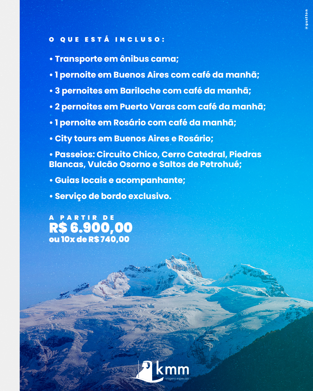 - Passeios Circuito Chico, Cerro Catedral (não incluso teleférico ou adicionais);