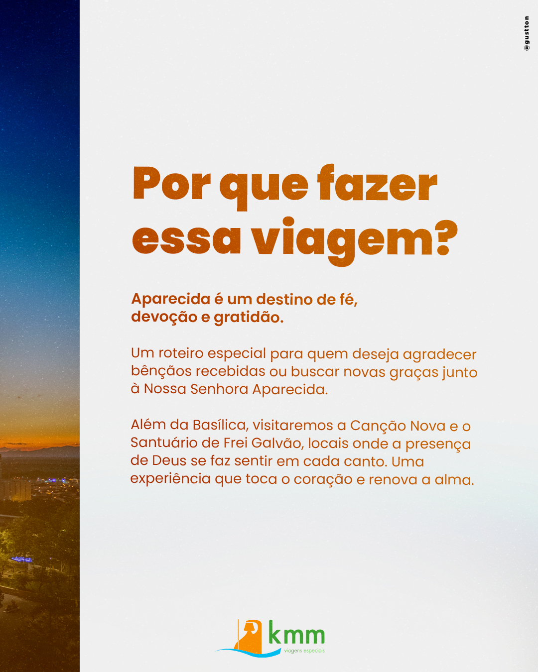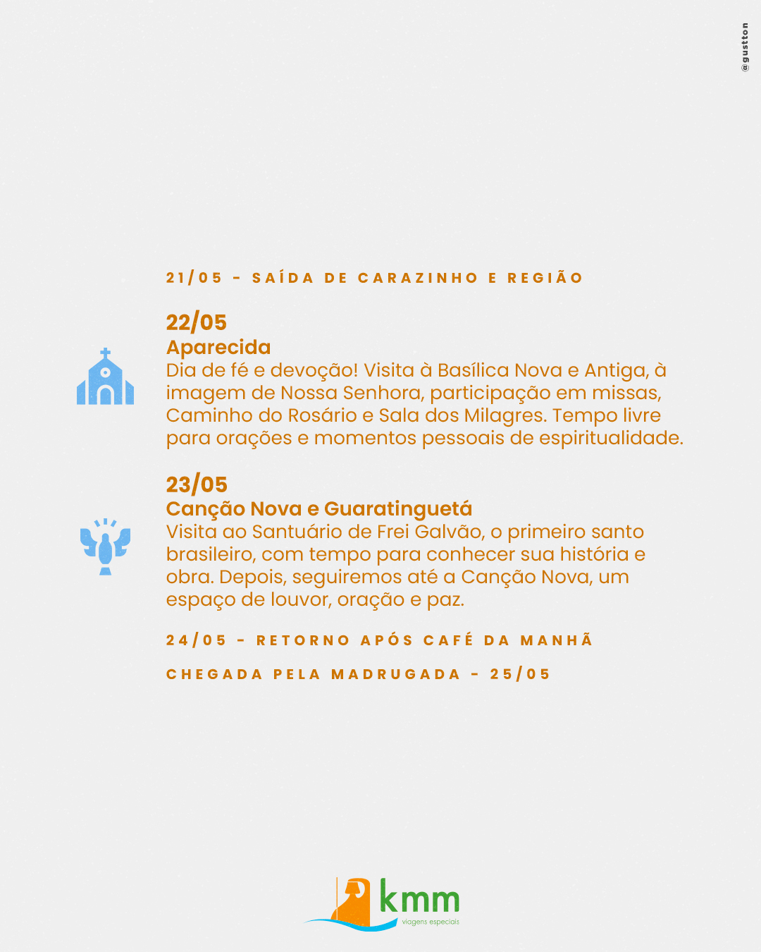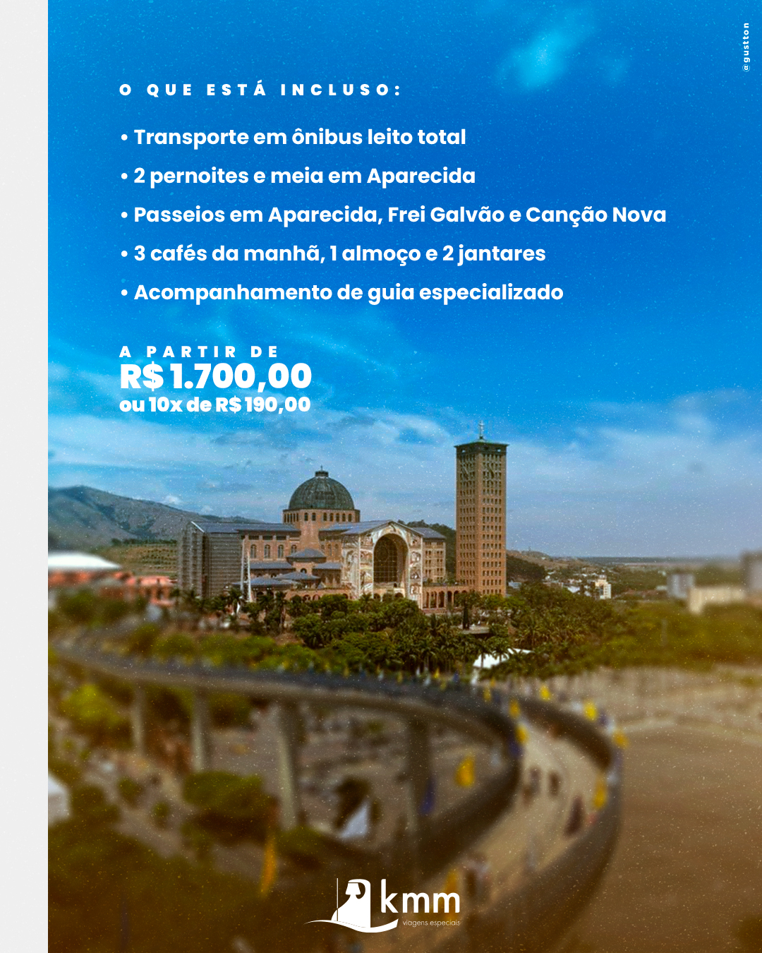 Vamos visitar o Santuário de Frei Galvão, o primeiro Santo Brasileiro, conhecer sua obra e um pouco da sua vida. Em seguida, iremos a Canção Nova, conhecido lugar de fé e devoção.