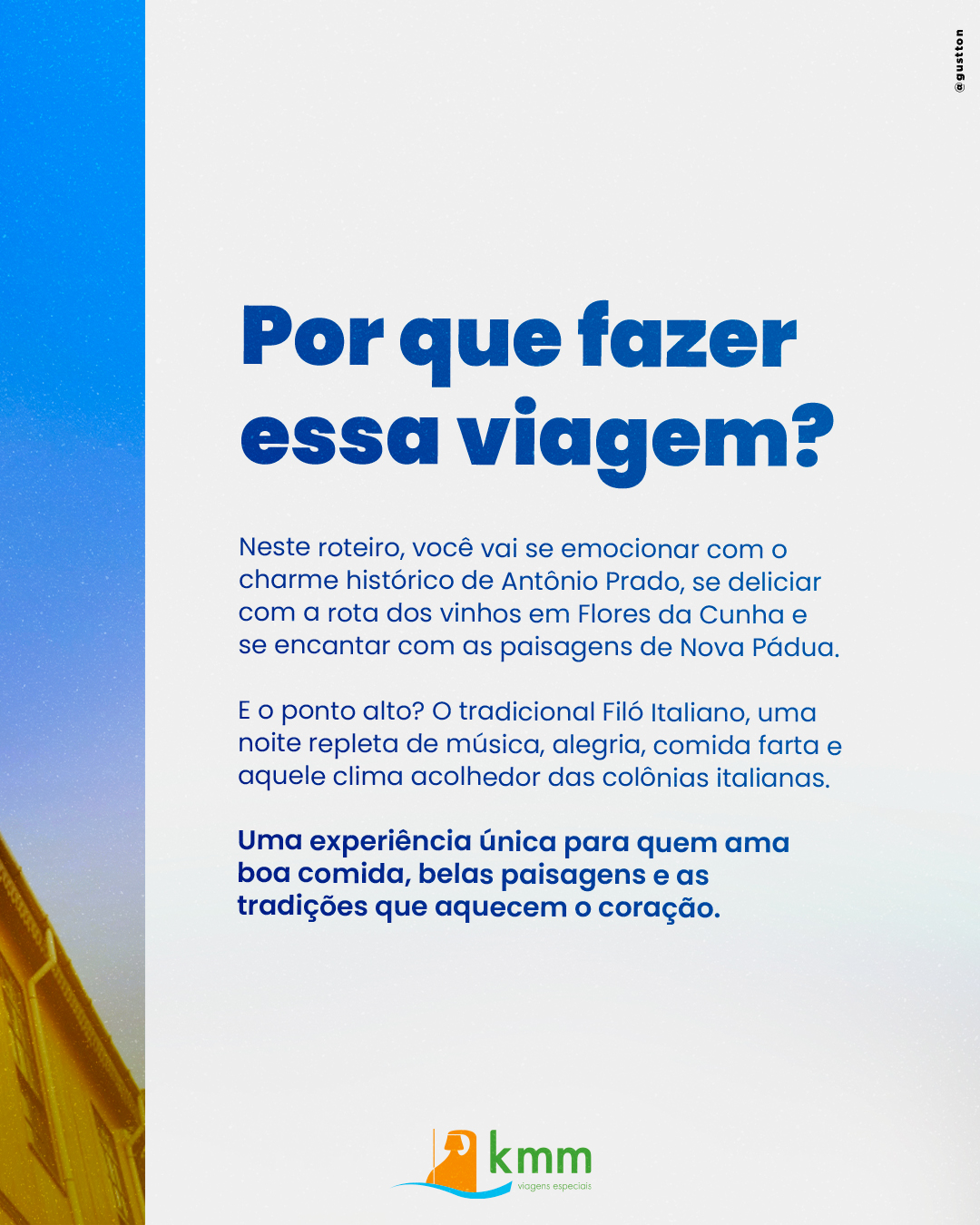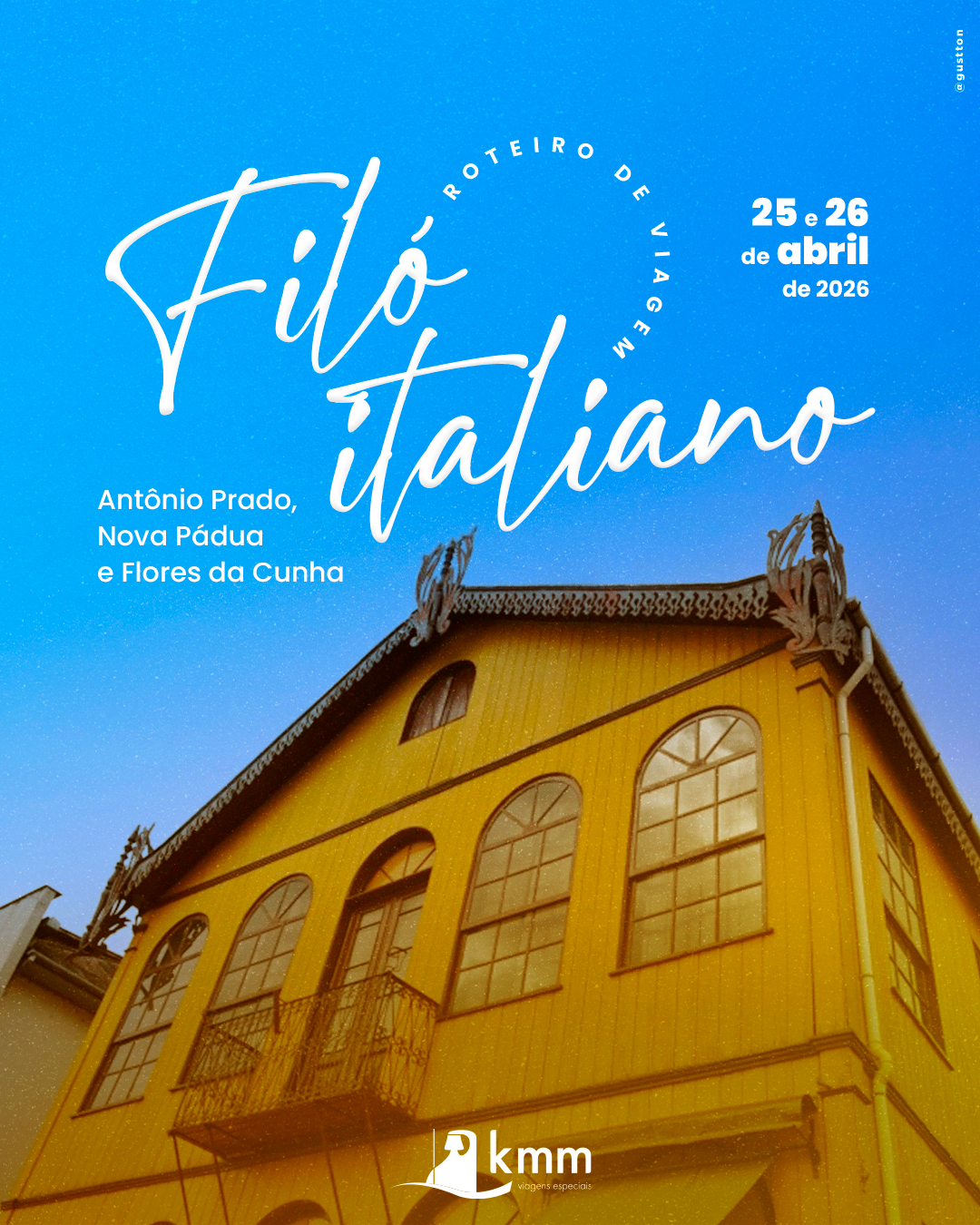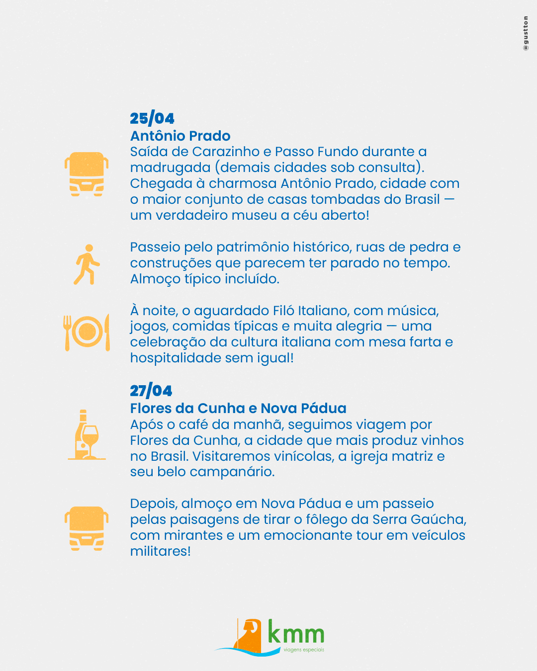 A comida da nona italiana, os jogos de antigamente, música e alegria... neste roteiro visitaremos o famoso filó de Antônio Prado, a rota dos vinhos de Flores da Cunha, os