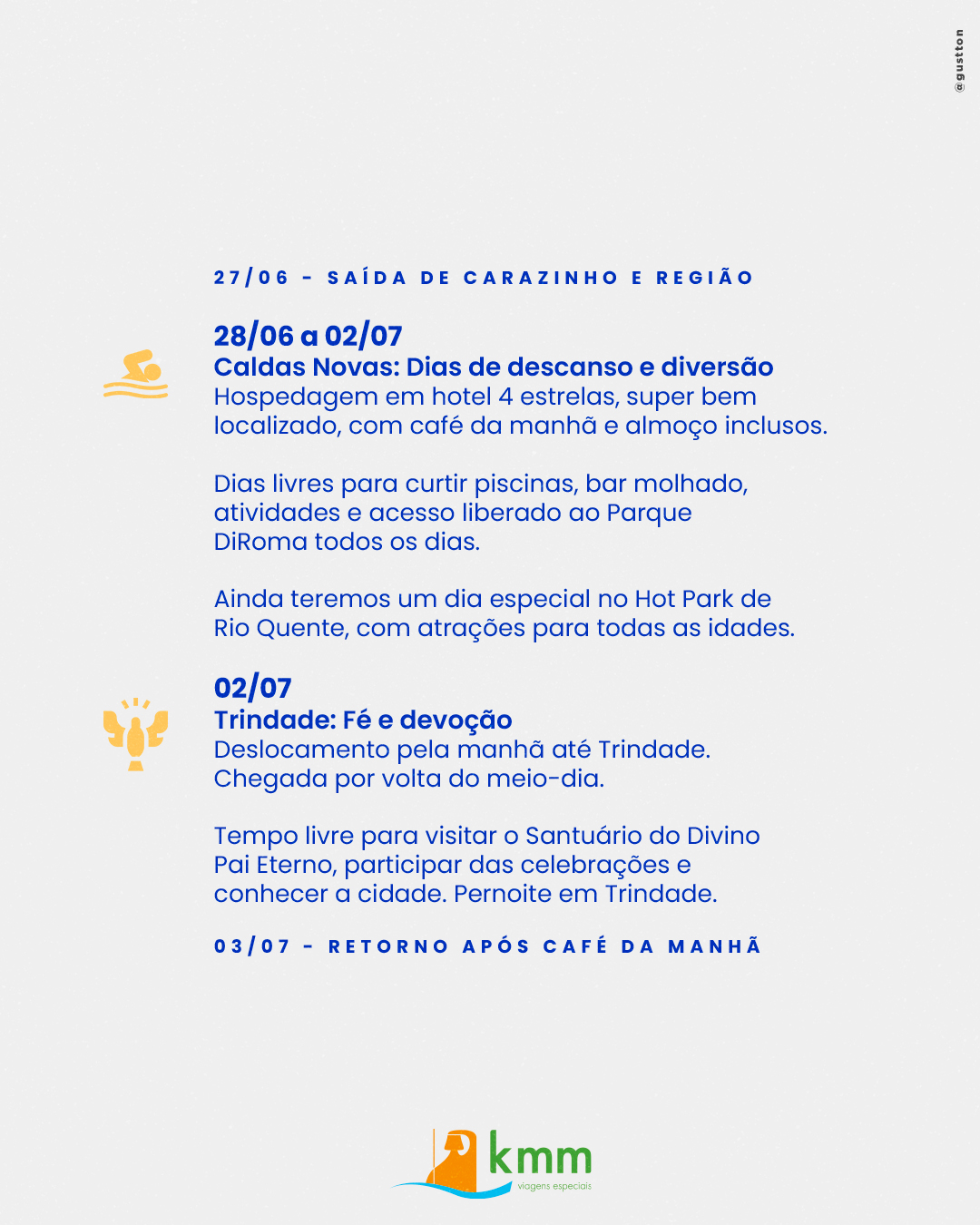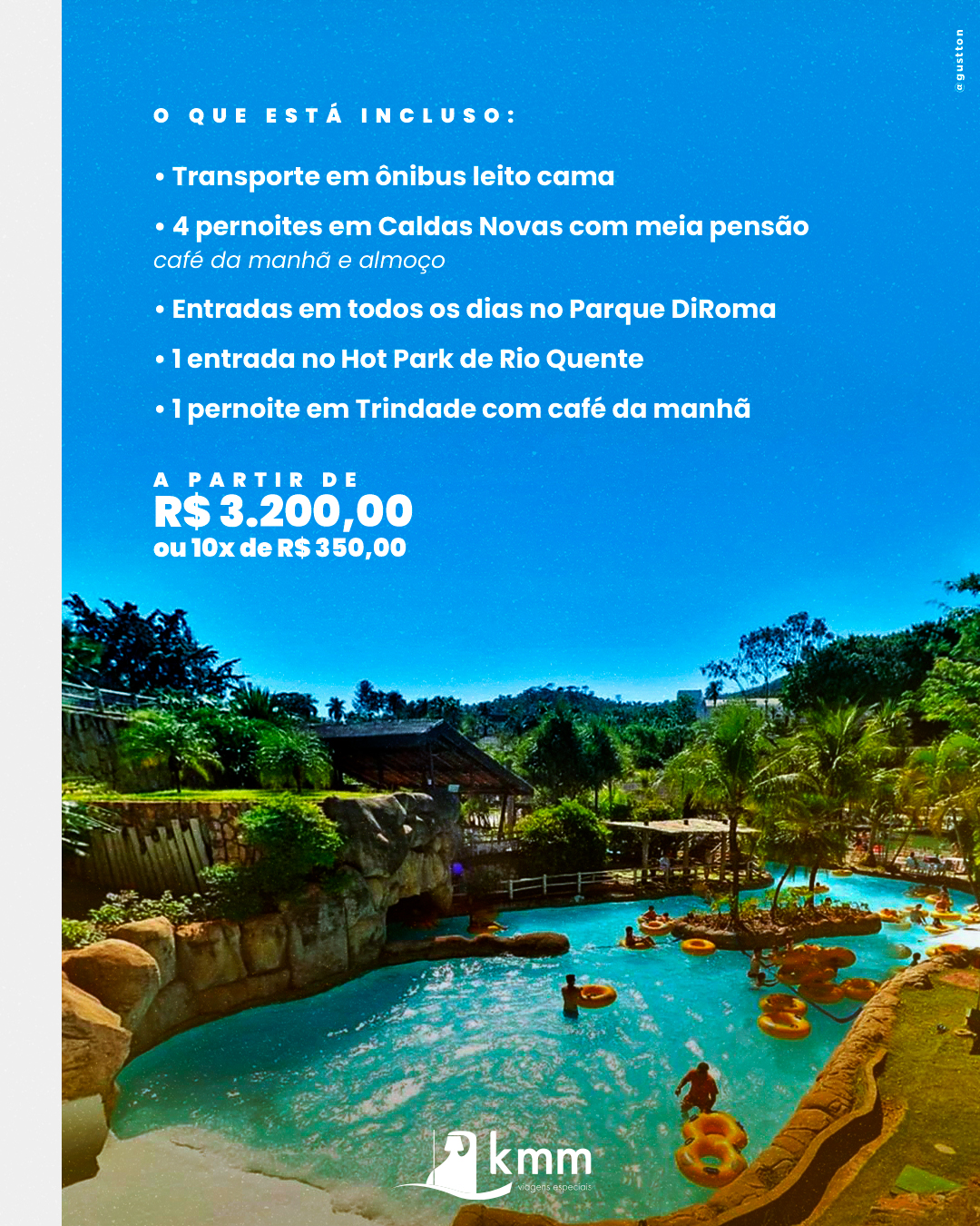 - 4 pernoites em Caldas Novas, com meia pensão: café da manhã e almoço;
