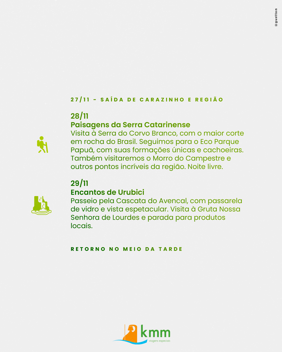 Um roteiro no coração da Serra Catarinense, repleto de paisagens deslumbrantes! Iremos conhecer a Serra do Corvo Branco, onde está o maior corte em rocha do Brasil. Visitaremos o Eco Parque Papuã, com sua passarela de vidro e duas cachoeiras, o Morro do Campestre e a Cascata do Avencal, uma das mais conhecidas da região.